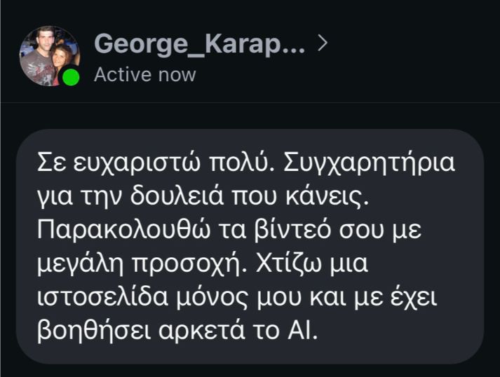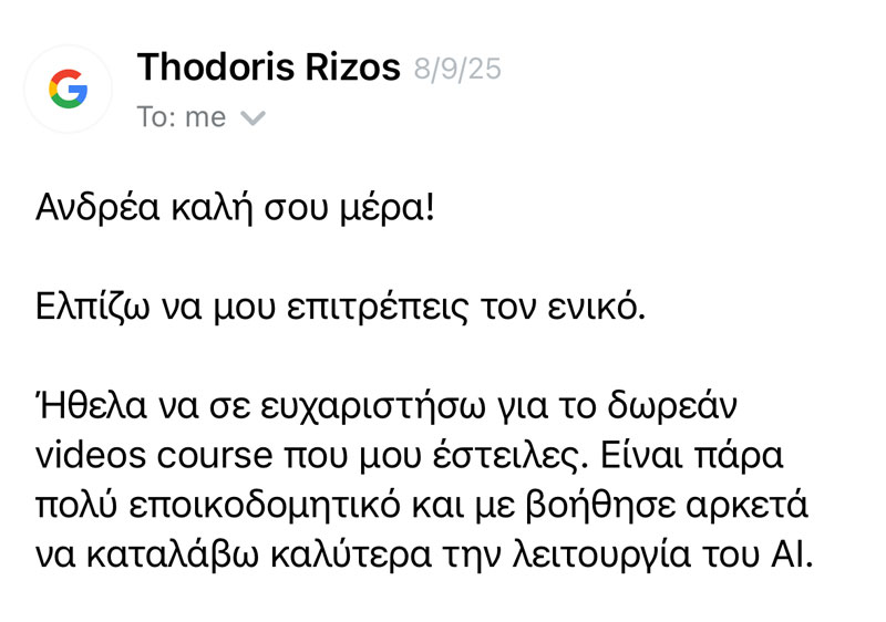 Έχω βοηθήσει πάνω από 100 επαγγελματίες, επιχειρήσεις και δημιουργούς να αξιοποιήσουν την τεχνητή νοημοσύνη στην πράξη.